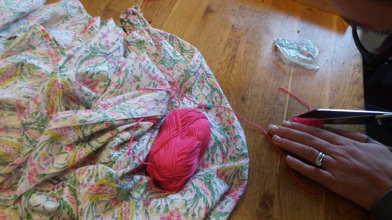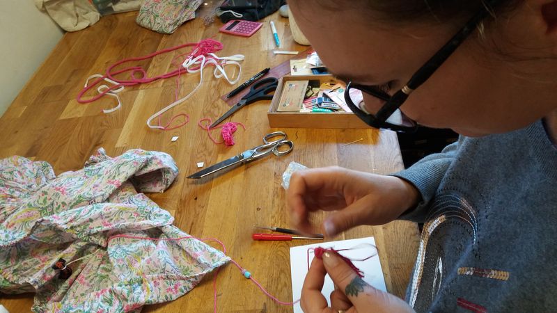J’en ai appris beaucoup dans l’atelier… droit-fil, chaîne-et-trame, point droit, point zigzag ou point de bâti, plis, pinces, fronces, emplacement, empiècement, poches et pattes de boutonnages, biais, doublures, surpiqûres et pompons !!